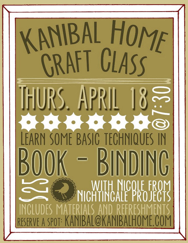 Get crafty with Kanibal this Thursday at 7:30pm when we welcome Nicole from Nightingale Projects into the shop again to teach a class on book binding. $25 includes the lesson, all materials + refreshments. RSVP in the comments or via email to kanibal (at) kanibalhome.com to reserve a spot.