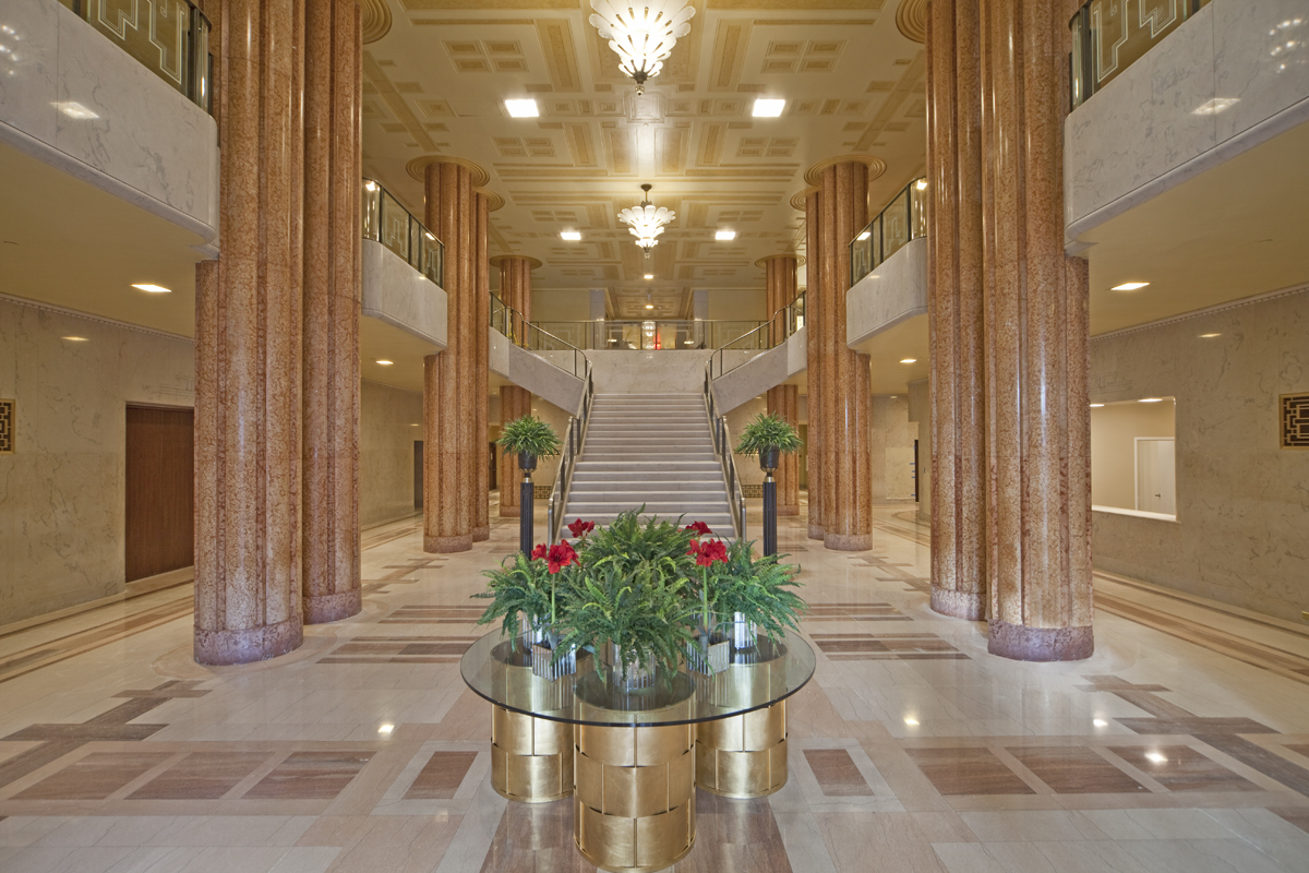 Previously sought out as the location for numerous movies due its unique Art Deco spaces, including Titanic, Quiz Show and Annie, The Paramount’s majestic lobby has been restored to its original 1930’s grandeur. Accessed through an octagonal vestibule, the lobby features a dramatic double-height space dominated by 12 marble columns and a grand stairwell of white and gray marble with silver and bronze handrails that leads to a mezzanine level also trimmed in marble.