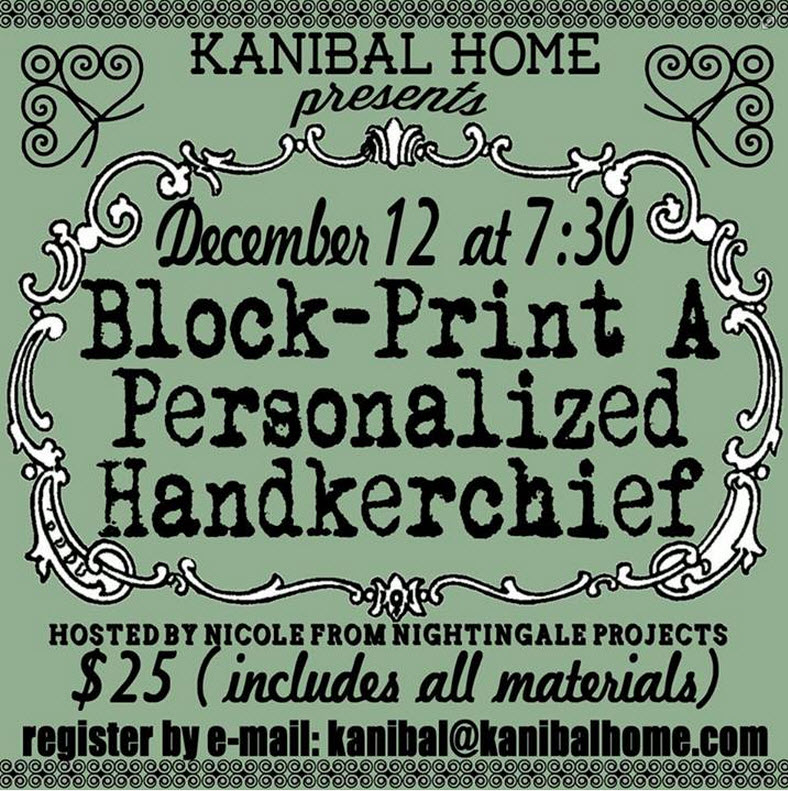Interested in making a custom handkerchief or pocket square? Then sign up for this Thursday‘s class at Kanibal Home — cost is $25 and includes the lesson, all supplies and refreshments! RSVP in the comments or via email to reserve a spot.