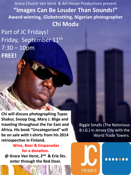 Award-winning, globetrotting, Nigerian photographer Chi Modu will be featured in the upcoming JC Fridays event on September 11th. Chi is a world renowned, iconic photographer whose photos have appeared on the covers of Rolling Stone Magazine and Jazz Times. The event will take place at Grace on the corner of 2nd & Erie Sts. in Downtown JC. An easy walk from the Grove St. PATH station.