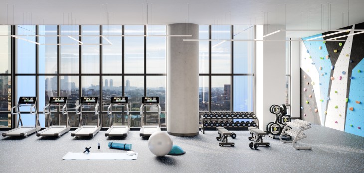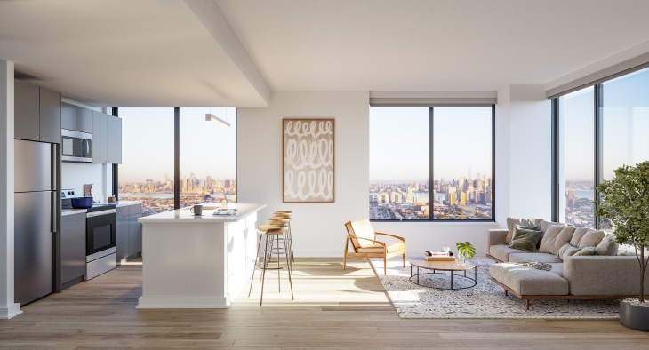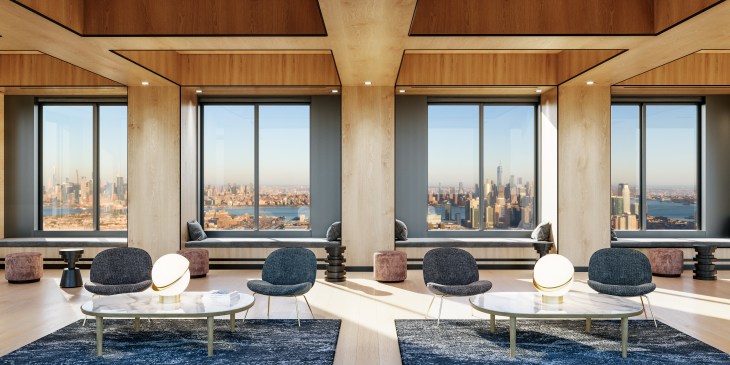 Enhancing the resident experience will be a full suite of indoor and outdoor amenities spread throughout multiple floors, totaling almost 100,000 square feet. Highlights include an outdoor deck with two pools, fire pits and private barbeque stations, multiple lounges and co-working spaces, and a state-of-the-art fitness center with a yoga /group fitness studio leading to an outdoor terrace, an indoor bouldering climbing wall, and a personal training room. The top floor Sky Lounge features banquette seating, large formal dining area, casual lounging and co-working spaces and unparalleled outward views to Manhattan. Resident services and additional conveniences at the property include a 24-hour attended lobby, package concierge, dedicated fenced-in dog park, and an enclosed parking garage.