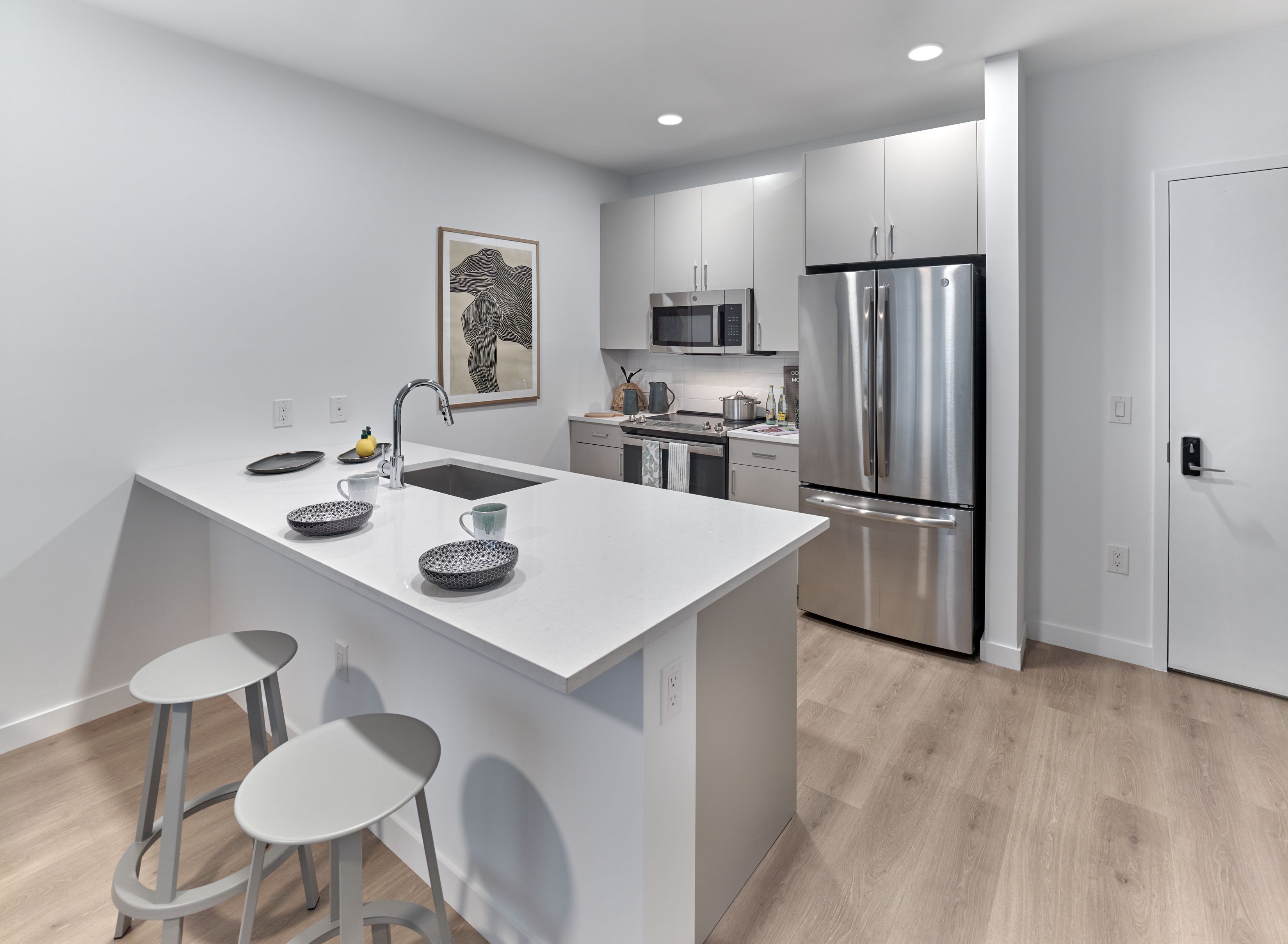 Stylish residences at The Agnes are adorned with premium stainless-steel appliances, quartz countertops, in-home washer and dryer, luxury plank flooring, custom closets, and soft-close Matte Gray cabinetry. Select homes include outdoor space.