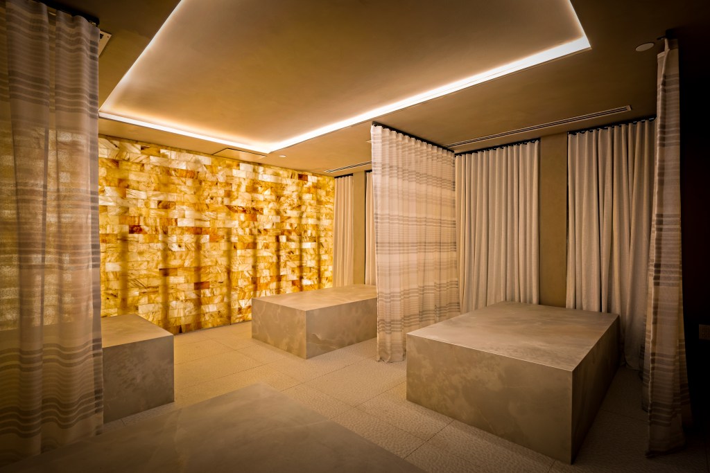 The world-class indoor and outdoor amenities at Solaia are highlighted by The Sanctuary, a three-story wellness center dedicated to rejuvenation and active lifestyles, for exclusive use of the residents and their guests. It features a fully equipped fitness center with 18-ft ceilings, TRX and boxing, and a steam room, sauna, experiential rain shower, Himalayan salt inhalation therapy room with infrared relaxation stations, jetted vitality tub, and dressing rooms with personalized residents’ lockers.