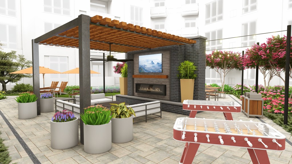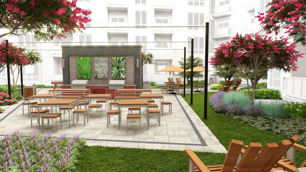 Residents will have access to a sophisticated array of amenities and services, including a state-of-the-art fitness center, resident lounge, co-working space, smart package room, covered parking with electric car charging stations, bicycle storage, and a complimentary resident shuttle to the Grove Street PATH station. An outdoor landscaped courtyard features dining areas, BBQ stations, lounge seating, firepits and foosball tables.