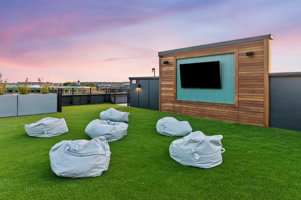 Hornrock Properties is continuing its winning streak with the recent opening of Ivy and Green in Downtown Hackensack, NJ. Just weeks since the leasing launch, the developer is pulling back the curtain on the rental building’s outdoor amenities. Let’s start with the sun-kissed courtyard, resort-style pool and sundeck, BBQs and even a pizza oven for outdoor dining. There’s also cozy dining and lounging areas, and an outdoor fitness turf. Saunter up to the landscaped roof deck where you’ll be treated to views of neighboring Foschini Park, the Hackensack River, and the Manhattan skyline. The rooftop is fully equipped with a bar, dining areas, TVs, and firepits. They’ve added a little extra fun with ping pong, foosball, a life-sized chessboard, and an outdoor movie screen with a viewing lawn. Studios, one- and two-bedroom residences from the $2,300s with Grand Opening incentives available.
