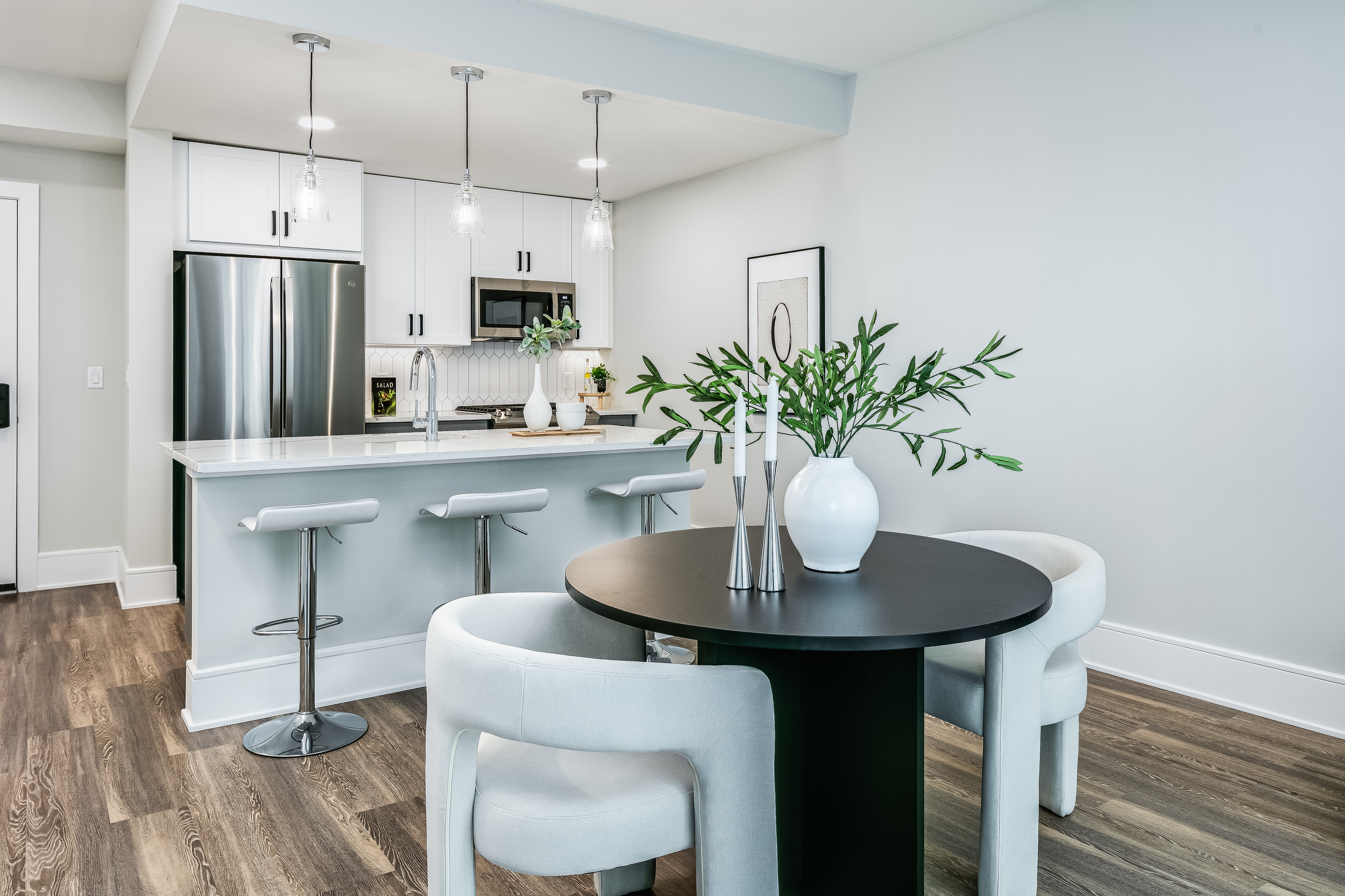 Designed by architect Michels & Waldron and interior designer Builders Design, Overlook Flats features loft-inspired apartments with nine-foot ceilings (with penthouses offering 12-foot ceilings), luxurious wide plank flooring, pre-installed living room fans for optimal comfort, and floor-to-ceiling windows that flood each space with natural light. Kitchens are equipped with GE stainless steel appliances and designer cabinetry, while lavish bathrooms boast frameless glass shower doors, quartz countertops, and Delta matte black fixtures. Residents are afforded the opportunity to personalize their living spaces on a first-come first-served basis, with a variety of homes offering two different color palettes for their kitchens and bathrooms. Homes located on odd-numbered floors will feature a lighter modern palette, while even-numbered floors feature a darker traditional palette, adding an additional layer of allure to the overall living experience.