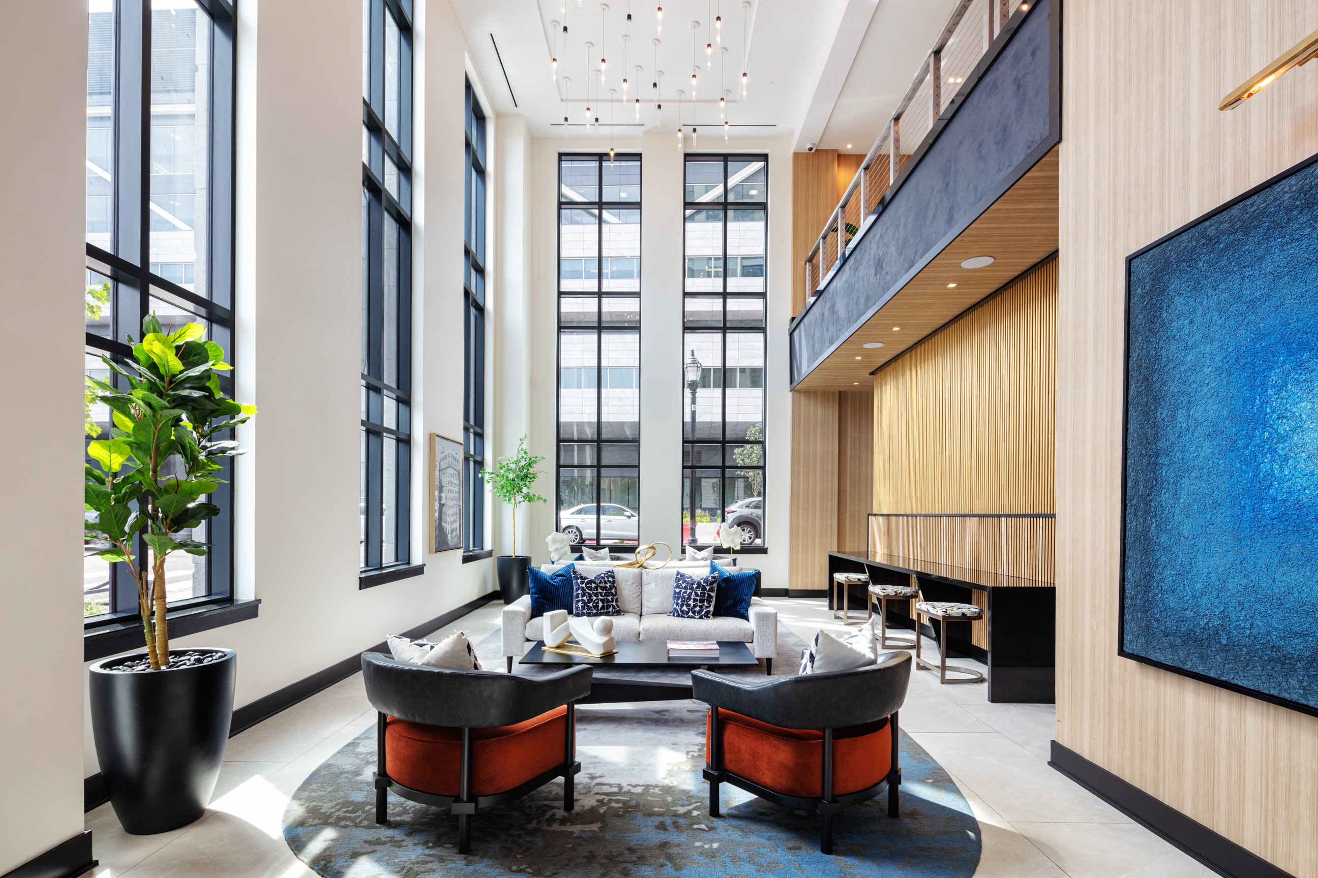 Kitchens are equipped with GE stainless steel appliances and designer cabinetry, while lavish bathrooms boast frameless glass shower doors, quartz countertops, and Delta matte black fixtures. Residents are afforded the opportunity to personalize their living spaces on a first-come first-served basis, with a variety of homes offering two different color palettes for their kitchens and bathrooms. Homes located on odd-numbered floors will feature a lighter modern palette, while even-numbered floors feature a darker traditional palette, adding an additional layer of allure to the overall living experience.