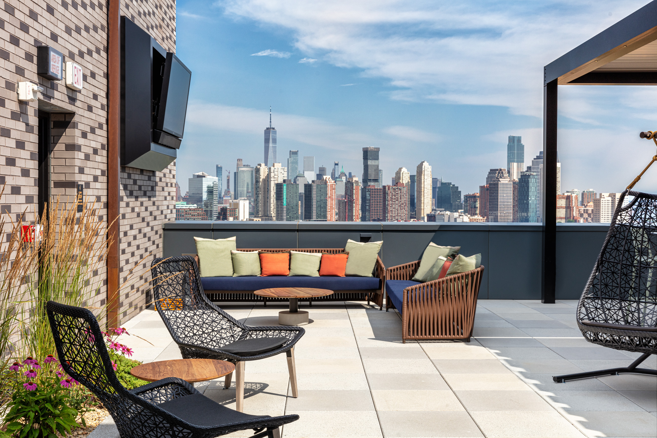 The outdoor recreation and social spaces have been perfectly designed by landscape architect Melillo|Bauer|Carman to create an ideal urban oasis. The rooftop amenity deck, one of Journal Square’s highest, offers a pool with a hot tub, chaise lounges, BBQ areas, game tables, and an indoor lounge with kitchenette, sports simulator, shuffleboard, and lounge seating. A second landscaped rooftop terrace provides firepits and additional picnic areas, as well as a bocce ball court and a pet playground.