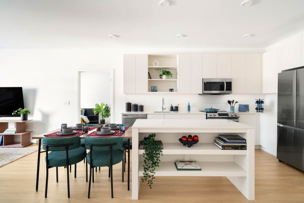 Inside, residents have access to a flexible media space, state-of-the-art fitness center with a dedicated yoga and meditation studio, recreation and poker room, playroom, and a dog run and wash area. There’s also endless work-from-anywhere options including individual co-working and group conference spaces, and a community hub with a resident’s lounge, library and meeting spaces.