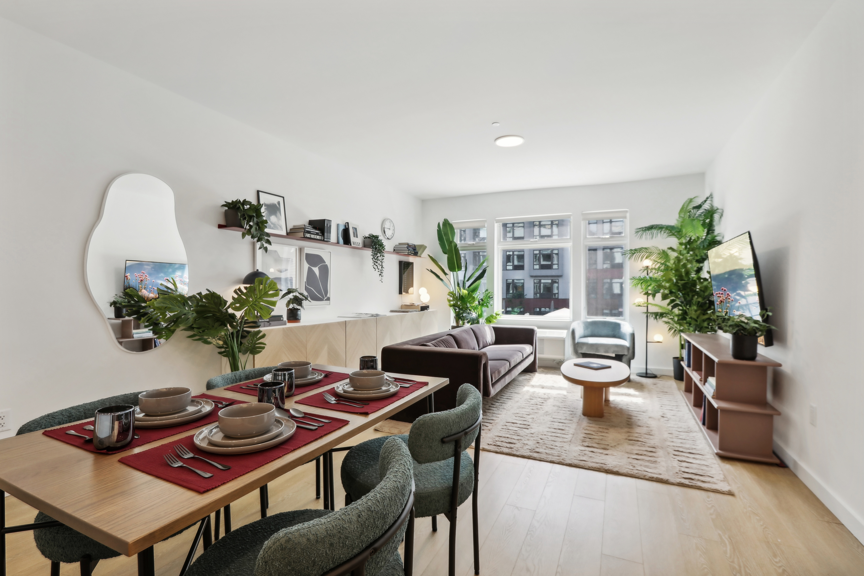 Inside, residents have access to a flexible media space, state-of-the-art fitness center with a dedicated yoga and meditation studio, recreation and poker room, playroom, and a dog run and wash area. There’s also endless work-from-anywhere options including individual co-working and group conference spaces, and a community hub with a resident’s lounge, library and meeting spaces.
